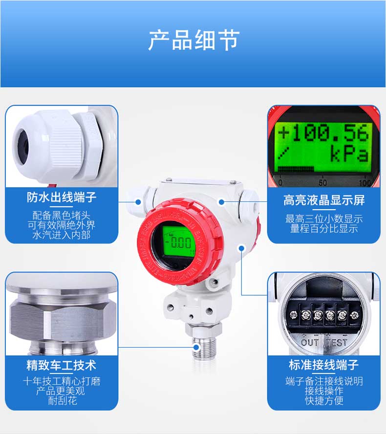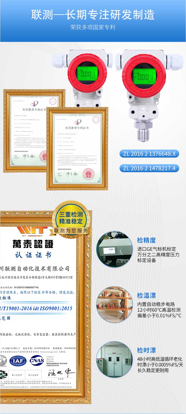 產(chǎn)品簡介:聯(lián)測SIN-P400全數(shù)字電路保證精度,保證長期零點和線性穩(wěn)定,現(xiàn)場液晶顯示,多種量程選擇,防雷擊,防射頻干擾,液晶顯示可通過按鍵調(diào)整零點和量程,方便用戶調(diào)試。