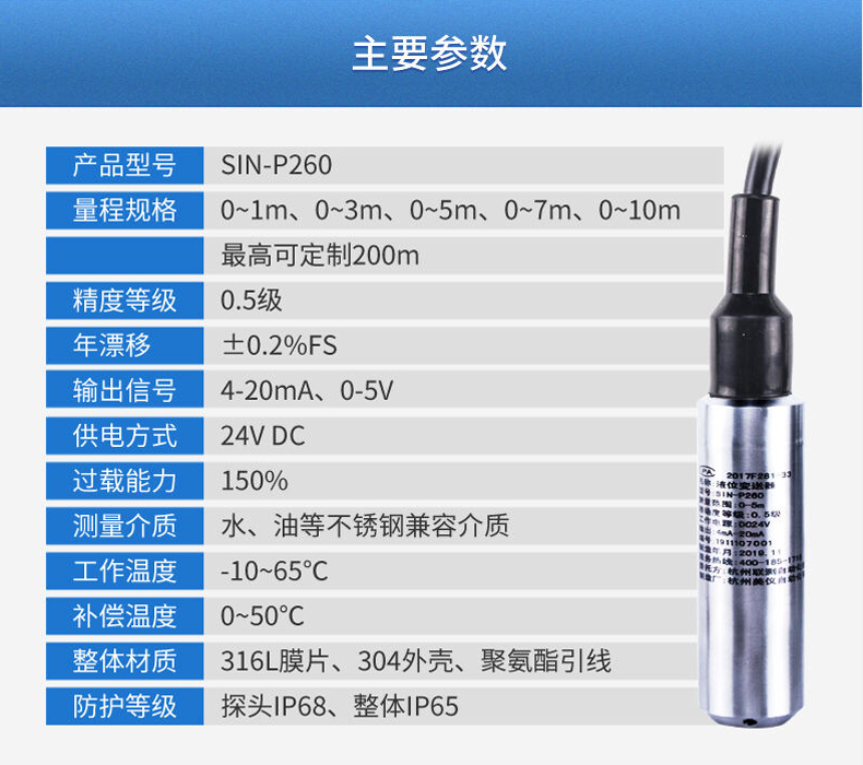 產品簡介:SIN-P260/P2600投入式液位變送器由高性能擴散硅壓阻式壓力傳感器作為測量元件,把與液位深度成正比的液體靜壓力準確測量出來,并經過信號調理電路轉換成標準(電流或電壓)信號輸出,建立起輸出信號與液體深度的線性對應關系,實現對液體深度的測量。