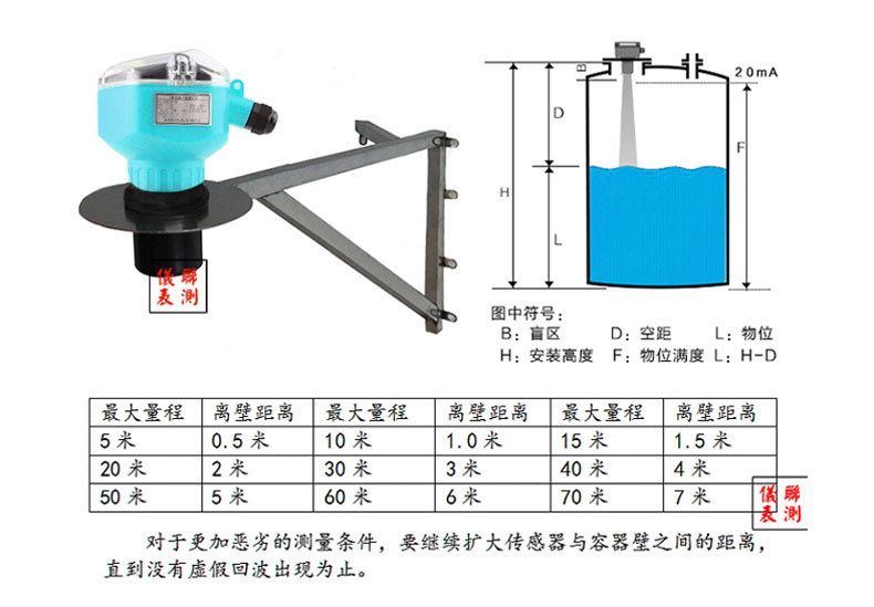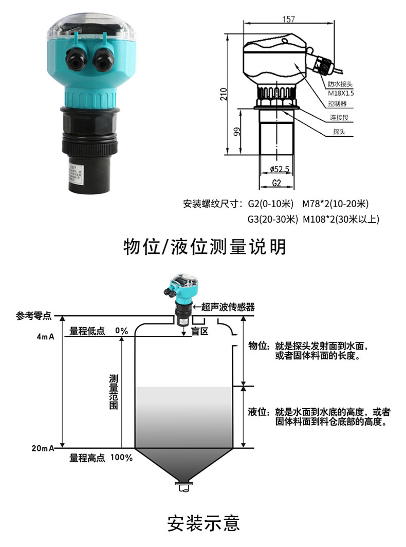 產(chǎn)品簡介:在測量中超聲波脈沖由傳感器(換能器)發(fā)出,聲波經(jīng)液體表面反射后被同一傳感器接收或超聲波接收器,通過壓電晶體或磁致伸縮器件轉(zhuǎn)換成電信號(hào),并由聲波的發(fā)射和接收之間的時(shí)間來計(jì)算傳感器到被測液體表面的距離。 由于采用非接觸的測量,被測介質(zhì)幾乎不受限制,可廣泛用于各種液體和固體物料高度的測量。