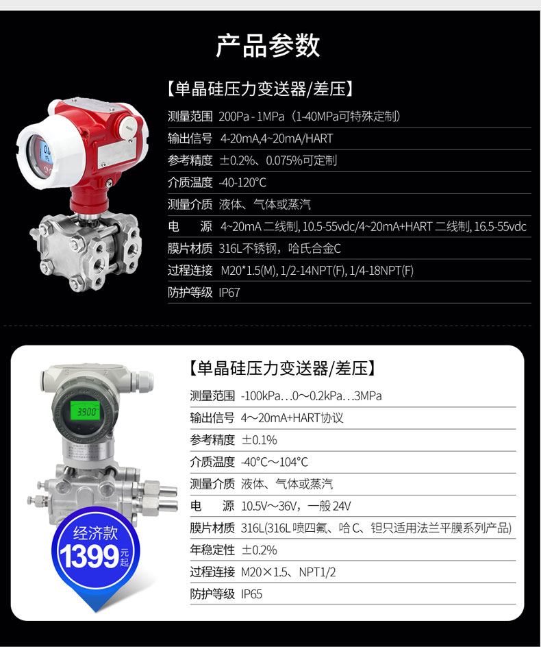 產品簡介:差壓安裝式表壓/絕壓變送器用于測量液體、氣體或蒸汽的液位、密度、壓力,然后將其轉變成4~20mADC HART電流信號輸出。采用先進的高精度單晶硅技術,測量精度高達0.075級,特有的雙過載保護膜設計,單向過壓高達40MPa。