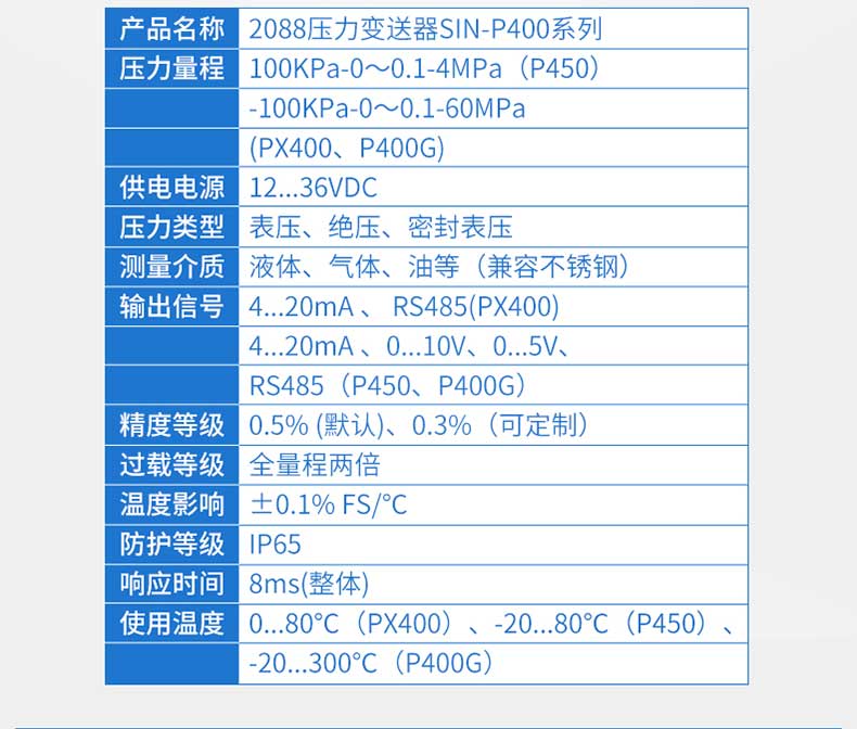 產(chǎn)品簡介:聯(lián)測SIN-P400全數(shù)字電路保證精度,保證長期零點和線性穩(wěn)定,現(xiàn)場液晶顯示,多種量程選擇,防雷擊,防射頻干擾,液晶顯示可通過按鍵調(diào)整零點和量程,方便用戶調(diào)試。